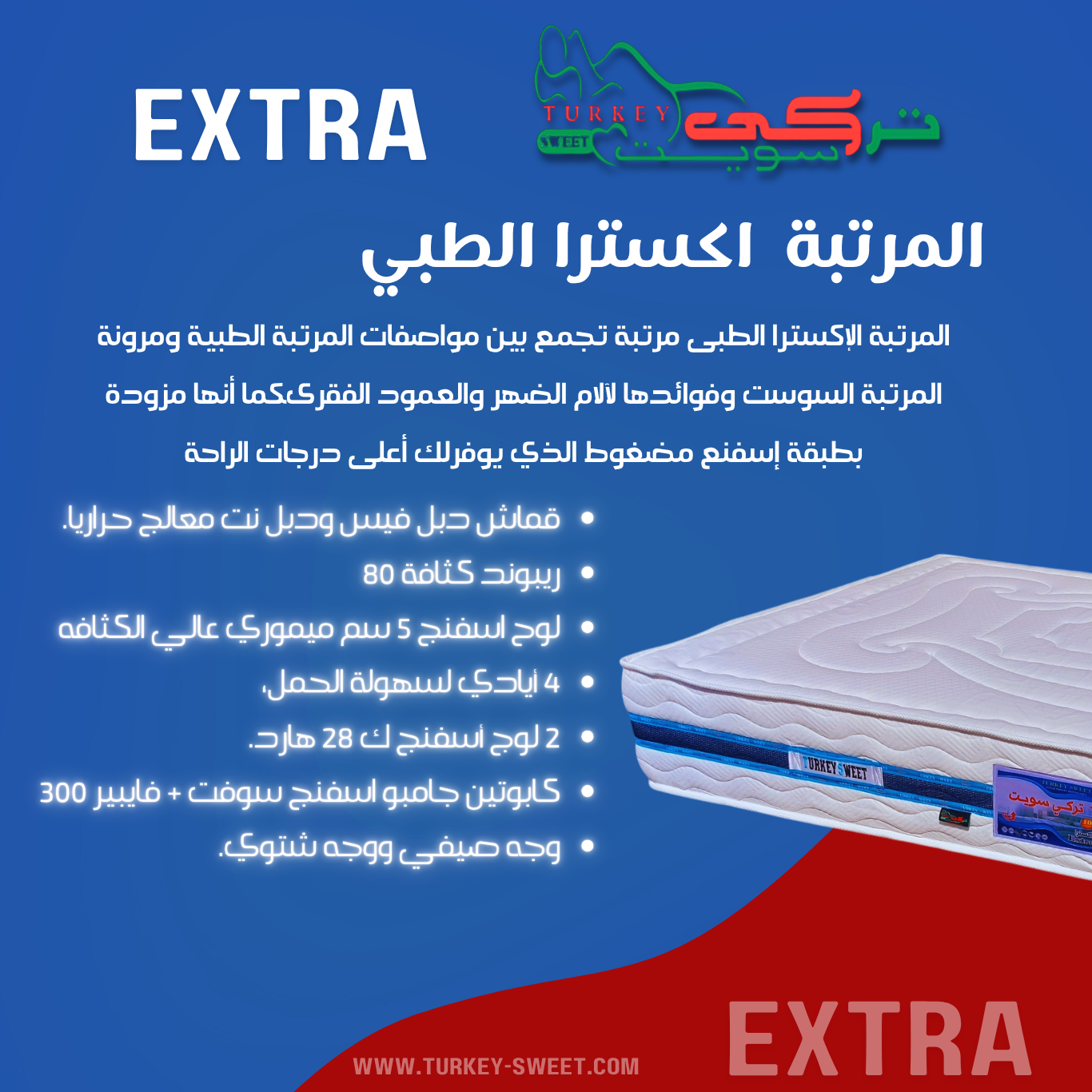 قم بجعل النوم تجربة صحية ومريحة مع مرتبة اكسترا الطبي، المصممة لتلبية احتياجاتك مهما كانت. لأن راحتك هي الأولوية!